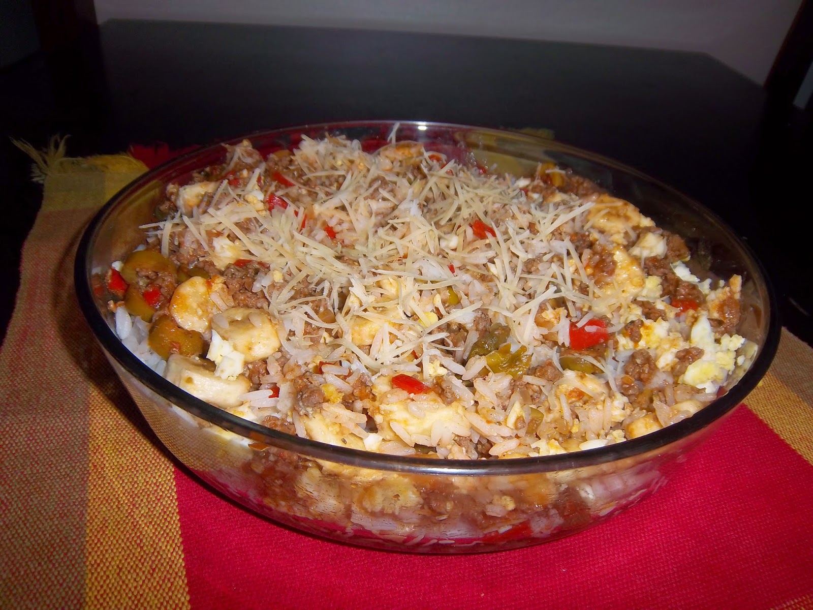 O melhor de tudo é que além de fácil de fazer, é um prato barato e que fica muito bonito, cheiroso e não tem quem não goste. Também é um preparo que nos dá base para fazer variações, por exemplo, arroz com frango ou carne seca em vez de carne moída. Vale substituir as azeitonas verdes picadas por milho cozido, dá pra trocar o molho de tomate por molho madeira. Só tem um ingrediente que, pra mim, é difícil trocar, a banana.