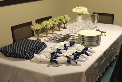 Se houver um buffet onde estarão as comidas, a mesa pode ser bem descontraída, inclusive, sem lugares marcados por pratos, copos e talheres. Uma forma bonita para a arrumação é empilhar os pratos e fazer fileiras com os copos e talheres, bem como dispor os guardanapos para que sejam usados de acordo com a vontade de cada um.