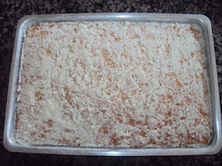 Assim que estiver assado, retire do forno e despeje o líquido por cima fazendo também furinhos na massa para que penetre bem a calda. Cubra com o coco ralado, polvilhando-o por toda extensão do bolo.