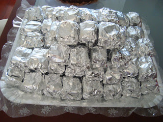 Uma dica: esse bolo é muito charmoso e entre suas facilidades está o fato de que ele não exige prato e talheres para ser degustado. Contudo é uma sobremesa bem doce. Então, a dica é: sirva pedaços pequenos. Eles são mais trabalhosos para embrulhar um a um, mas facilitarão para as pessoas que não gostam muito de doces demasiadamente melados e molhados… Um pedacinho basta para uns. Outros, comerão vários, isso é uma certeza.