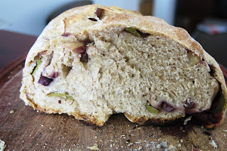 Eu me meti a fazer um pão com azeitona e castanha e outro com ameixa e uva passa. Além dos dois pães sem nada, só com farinha integral e branca. Ficaram bonitos, crescidos e fofinhos, mas ainda há muito pra melhorar.