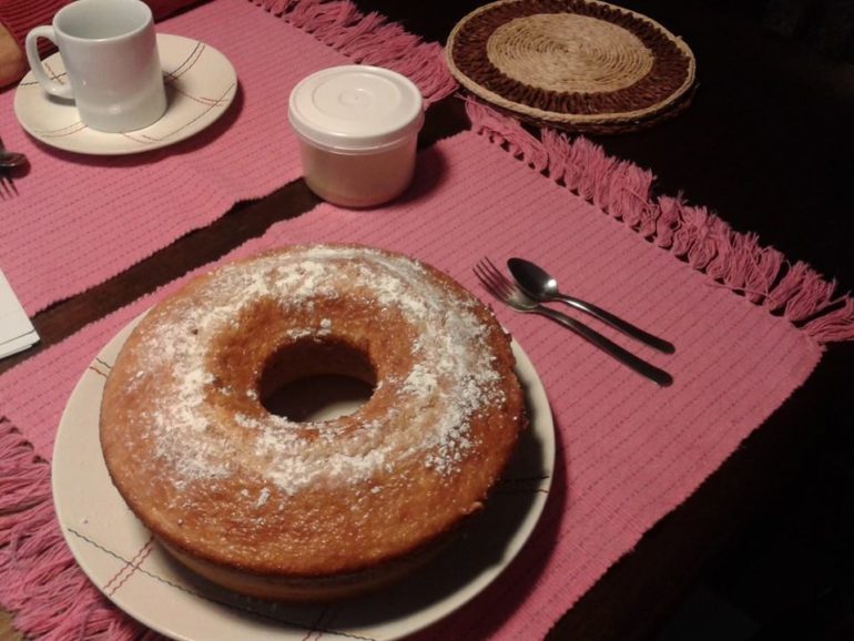 Esse bolo, minha avó fazia todo sábado à noite, logo depois da novela das oito. Ele era batido na mão porque na casa dela não tinha batedeira. Quando nós estávamos lá, minha irmã Cristina batia a massa e eu, como era menor, as claras em neve.
