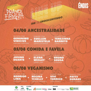 Na sexta-feira, 06/ago, o papo é sobre veganismo, com Vivi Torrico, do Solidariedade Vegan, Regina Tchelly, do Favela Orgânica, e mediado pela Paty Durães, que faz parte do Afrolab Gastronomia, é curadora da Cozinha da Casa Preta Hub e trabalhou com a Énois na produção do Prato Firmeza Preto.